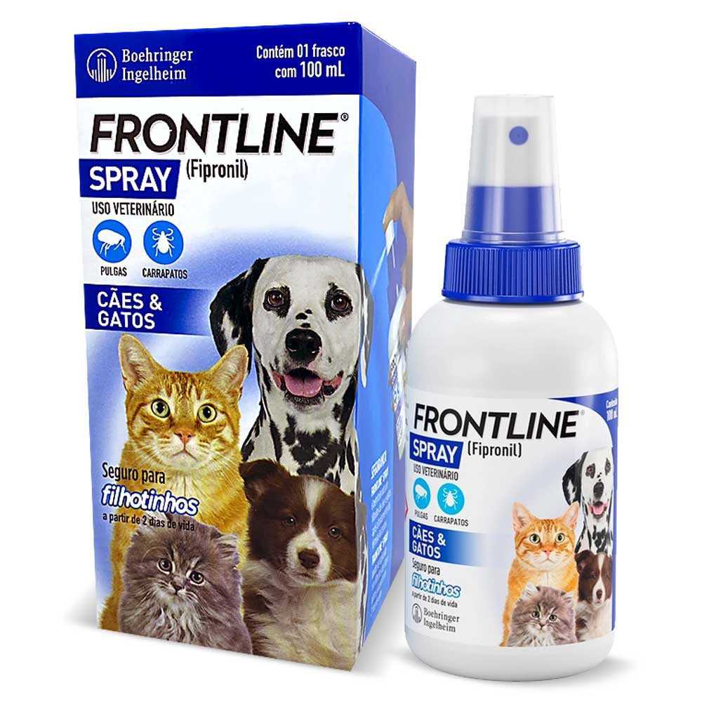 Para o tratamento e controle de infestações por pulgas e carrapatos, o spray antipulgas Frontline pode ser aplicado em animais filhotes, a partir de 2 dias de vida. Segundo a bula, o mecanismo de ação do medicamento em cães (adultos e filhotes) protege contra pulgas por até 3 meses e contra carrapatos por 5 semanas.