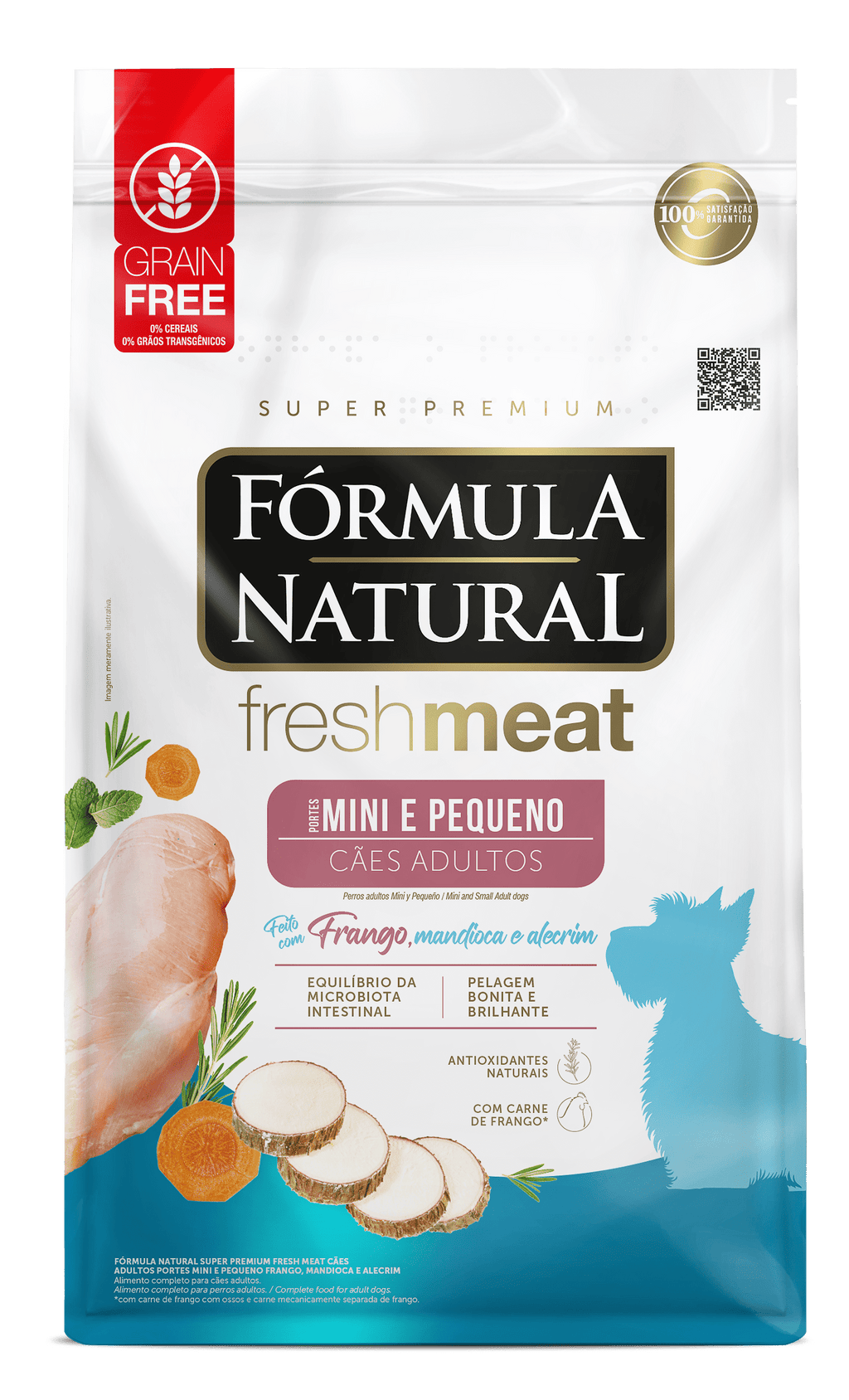 A Ração Fórmula Natural Fresh Meat Cães Adultos Mini e Pequeno Frango foi desenvolvida por médicos-veterinários utilizando os conceitos mais avançados de nutrição para sua elaboração. Possui, como grande diferencial, a utilização de diferentes cortes de carne, uma variedade de frutas e vegetais e sem a utilização de grãos.