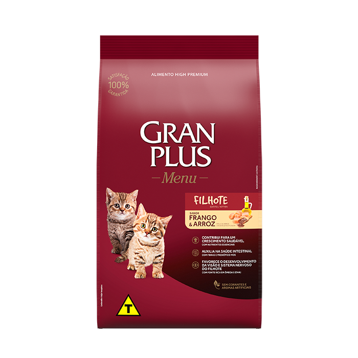 A Ração GranPlus Menu Gatos Filhotes Frango e Arroz é um alimento High Premium de alta qualidade e feito com ingredientes nobres e funcionais que proporcionam uma experiência irresistível para seu gato filhote enquanto ajuda no seu crescimento e desenvolvimento.
